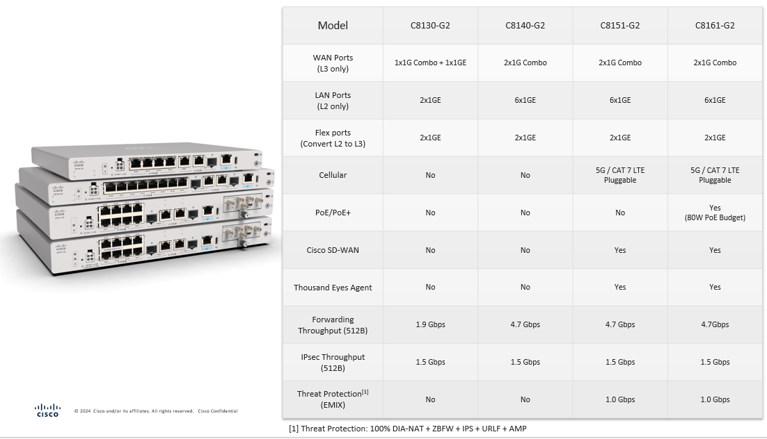 Trong đó, C8151‑G2 và C8161‑G2 hỗ trợ Cisco SD‑WAN và PIM 4G/5G, phù hợp cho các mô hình kết nối linh hoạt.