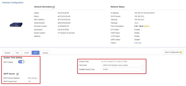 Với Tab NTP và Syslog chúng ta có thể tùy chỉnh thời gian cho thiết bị và lưu trữ log của thiết bị.