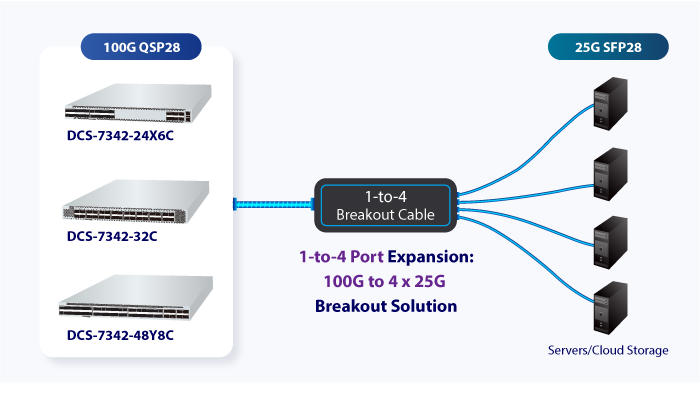 Cho phép kết nối một cổng 100G ở tầng spine trực tiếp tới bốn switch leaf 25G hoặc server, tạo ra một mạng fabric có khả năng mở rộng cao và hiệu quả chi phí.