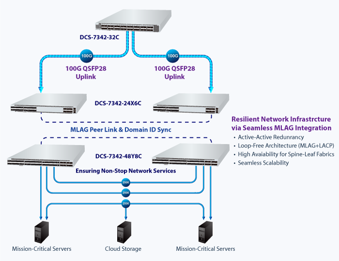 Để đảm bảo dịch vụ mạng hoạt động liên tục và tối đa hóa việc sử dụng băng thông, PLANET DCS-7342-48Y8C Version 2 hỗ trợ công nghệ Multi-Chassis Link Aggregation (MLAG) tiên tiến. Công nghệ này mang lại độ tin cậy cấp carrier và tính linh hoạt về kiến trúc cho các hạ tầng quan trọng.