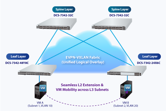 Để xử lý hiệu quả sự phức tạp của các hạ tầng cloud hiện đại, PLANET DCS-7342-48Y8C Version 2 tích hợp Virtual Extensible LAN (VXLAN) và Ethernet VPN (EVPN) được tăng tốc bằng phần cứng, nhằm xây dựng các mạng overlay ảo hóa có hiệu năng cao và khả năng mở rộng lớn.