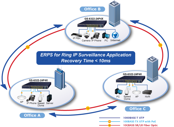 GS-6322-24P4X hỗ trợ công nghệ vòng dự phòng (redundant ring) với khả năng tự phục hồi mạnh mẽ và nhanh chóng, giúp ngăn chặn gián đoạn dịch vụ và bảo vệ mạng khỏi sự cố bên ngoài.