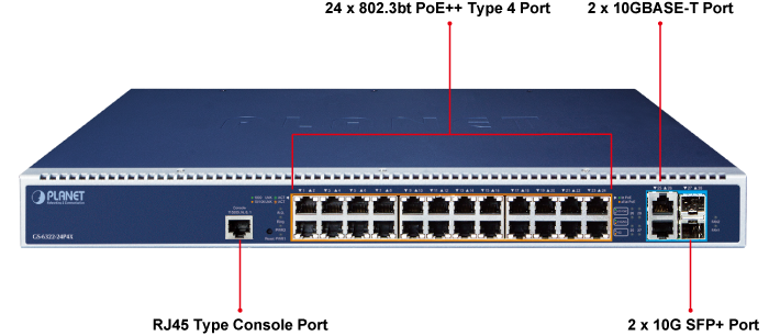 Nhờ áp dụng chuẩn IEEE 802.3bt PoE++ cùng công nghệ PoH (Power over HDBase-T), GS-6322-24P4X có khả năng cấp nguồn lên đến 95 watt thông qua toàn bộ 4 cặp dây của cáp Ethernet Cat5e/6 tiêu chuẩn, đồng thời truyền dữ liệu tốc độ cao đến từng thiết bị nhận PoE (PD – Powered Device) từ xa.